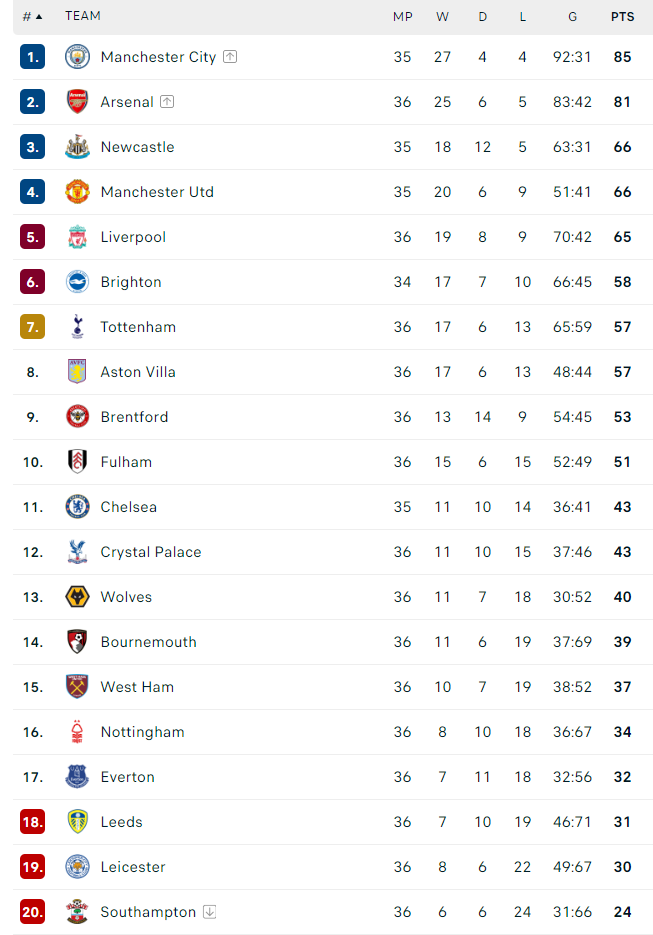 ამ მომენტისთვის ინგლისელის ჩემპიონატის ცხრილი ასე გამოიყურება: