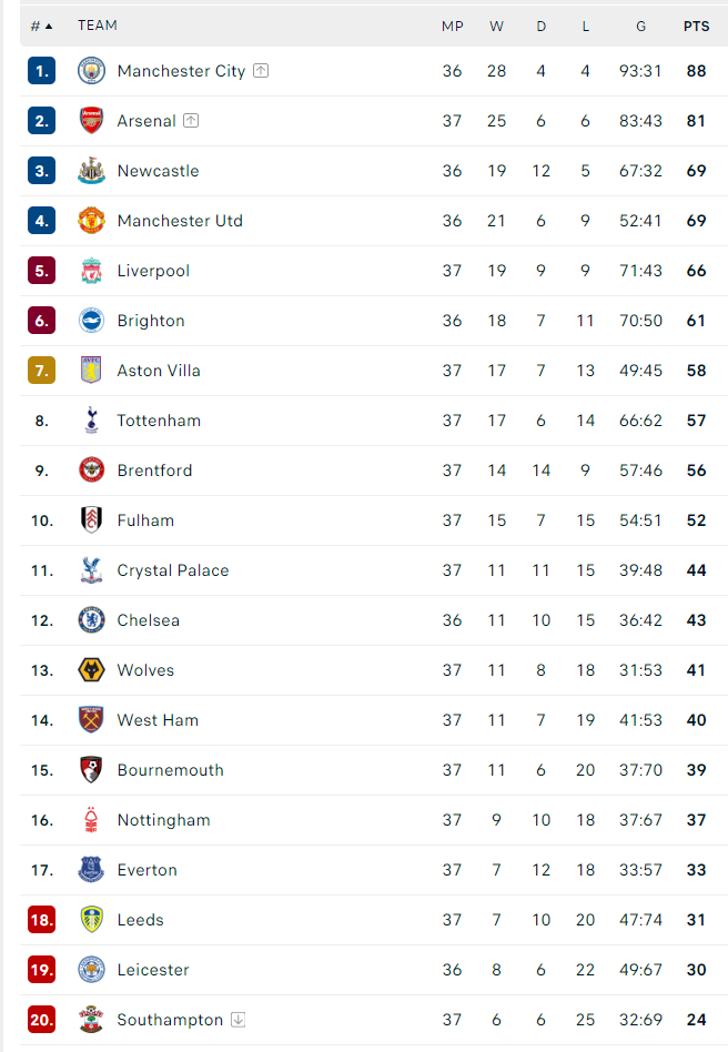 იმისათვის, რომ "წითლებმა" ოთხეულში შეაღწიონ, საჭიროა, რომ "მანჩესტერ იუნაიტედმა" დარჩენილი ორივე შეხვედრა წააგოს, ხოლო "ლივერპულმა" ბოლო ტურში "საუთჰემპტონს" აჯობოს.